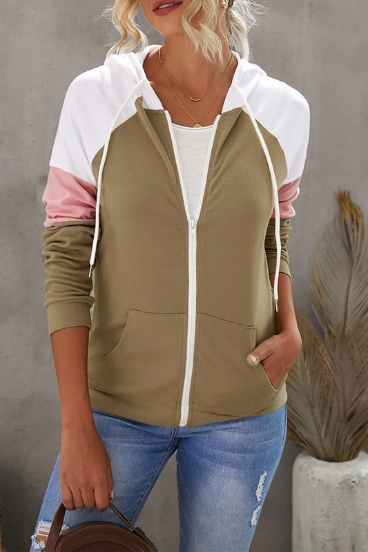 Khaki Color Block Zip Up Kangaroo Pocket Drawstring Hoodie
