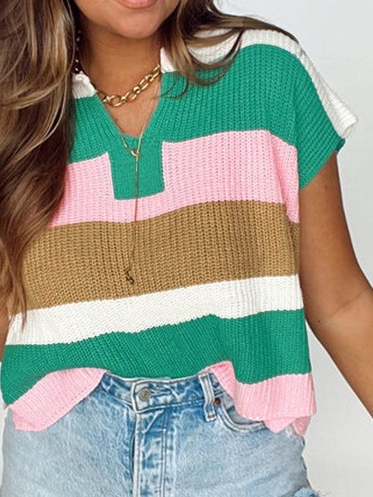 Cotton Colorblock Notch V Neck Knit T Shirt